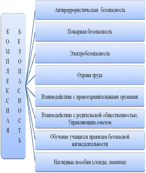 Система комплексной безопасности подразумевает состояние защищенности образовательного учреждения от реальных и прогнозируемых угроз социального, техногенного и природного характера, обеспечивающее его безопасное функционирование. Поэтому нет важнее задачи для образовательного учреждения, чем обеспечение безопасных условий проведения учебно-воспитательного процесса, которые предполагают гарантии сохранения жизни и здоровья обучающихся.